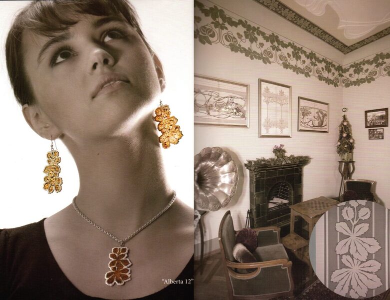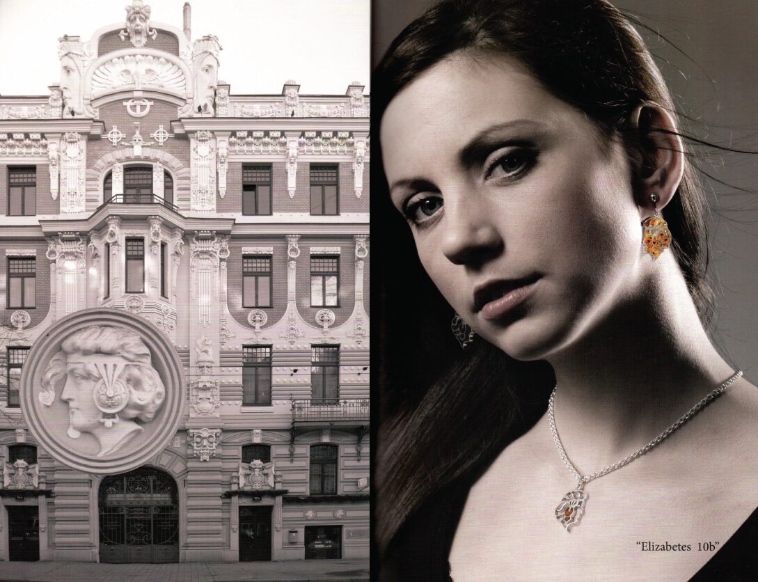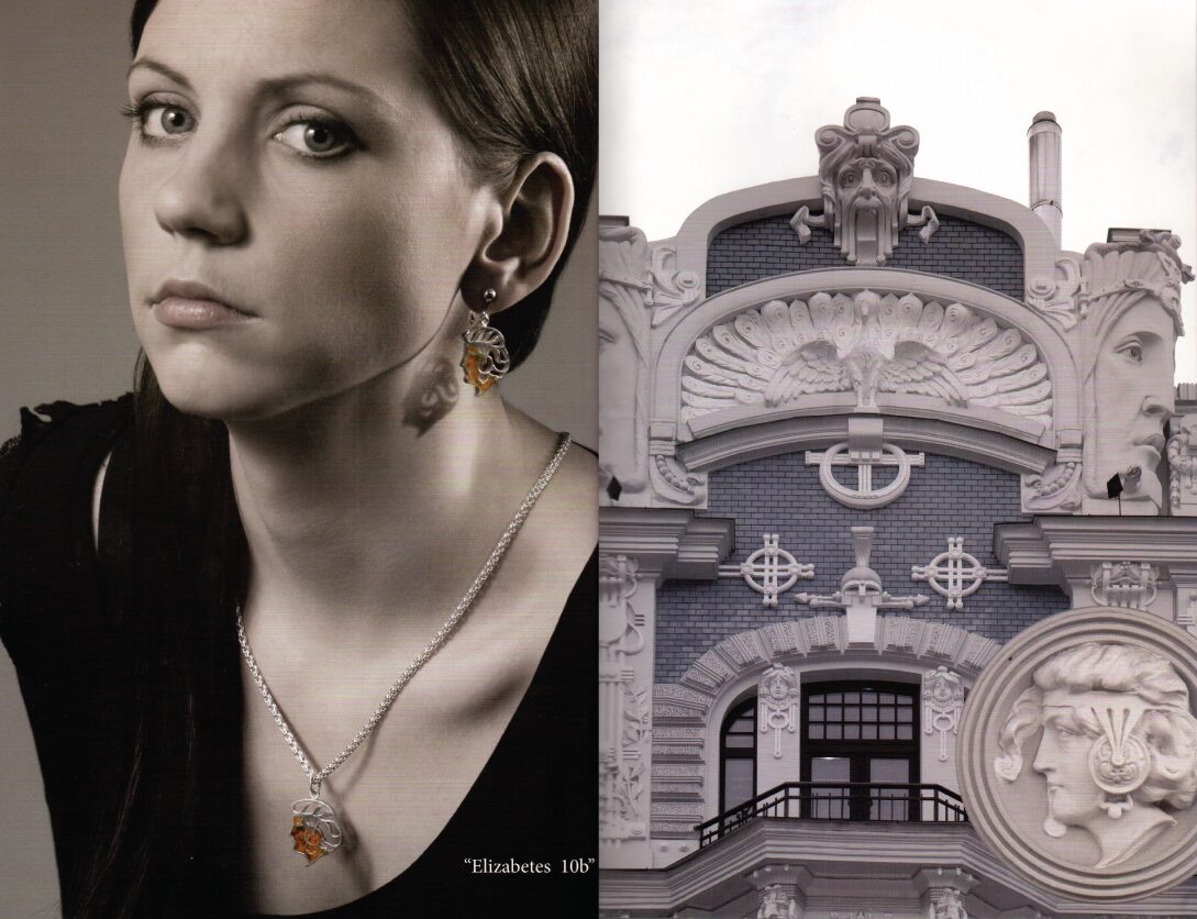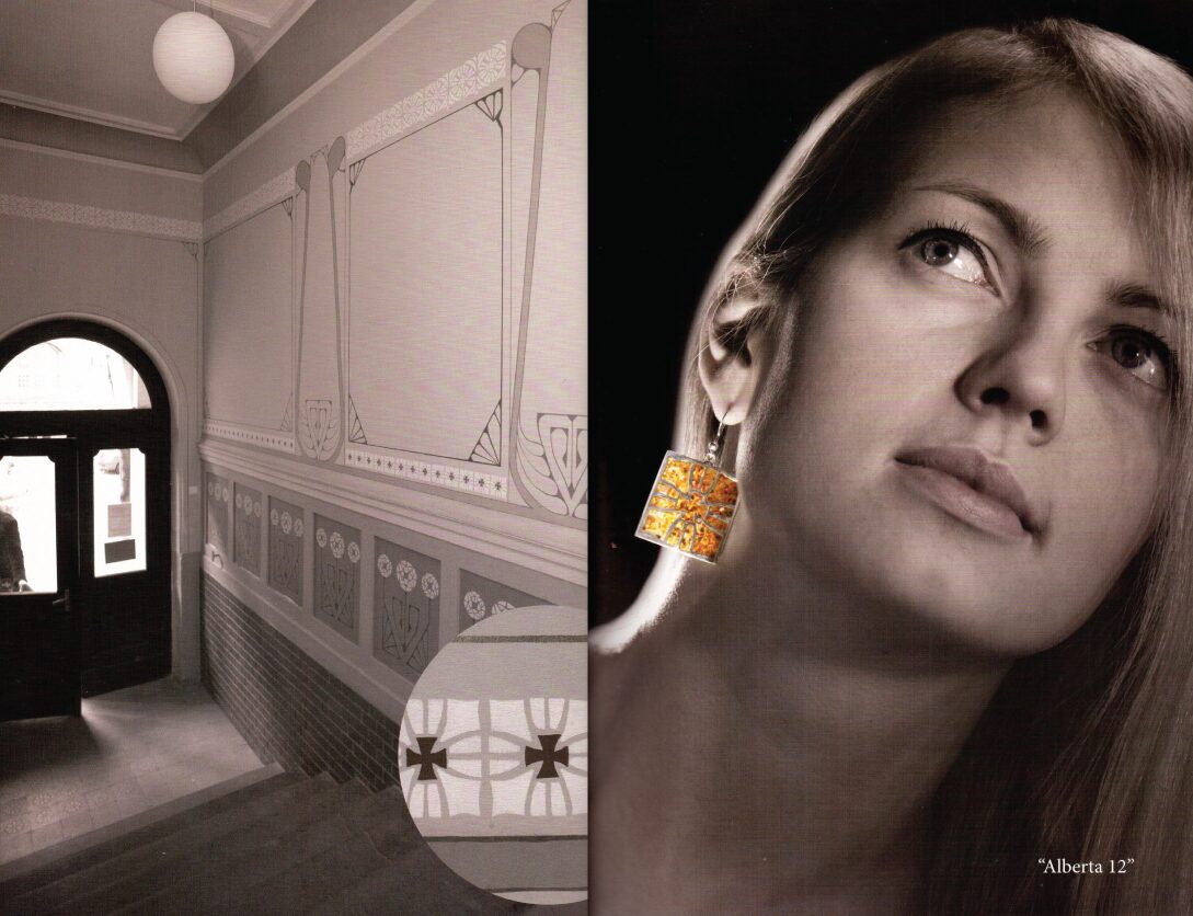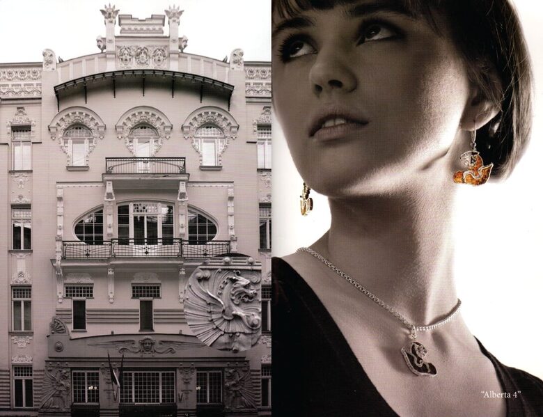 Amber is incorporated into the jewelry using a unique combination of technologies, allowing it to retain its color and shine over time. The jewelry is light and delicate—featuring portraits of Art Nouveau buildings, plant motifs, birds, and other elements.