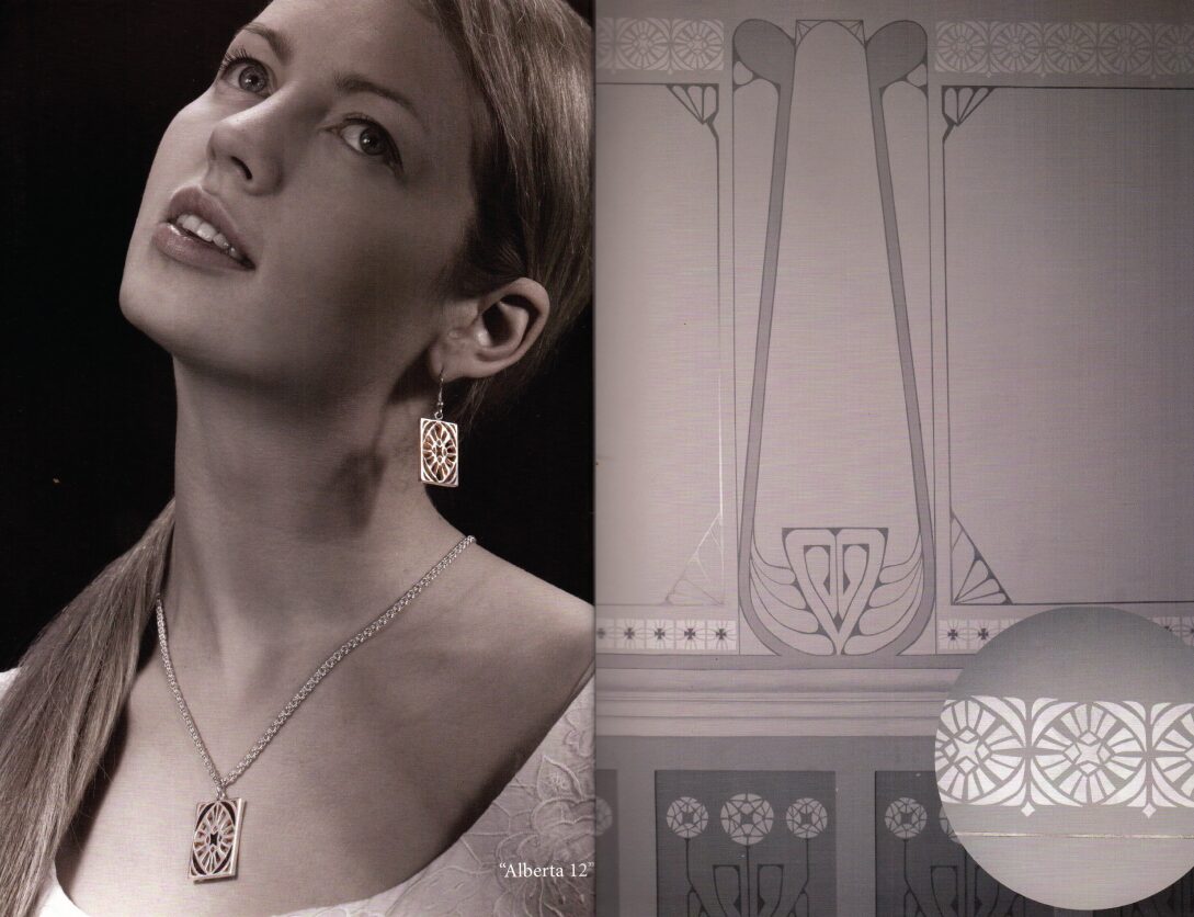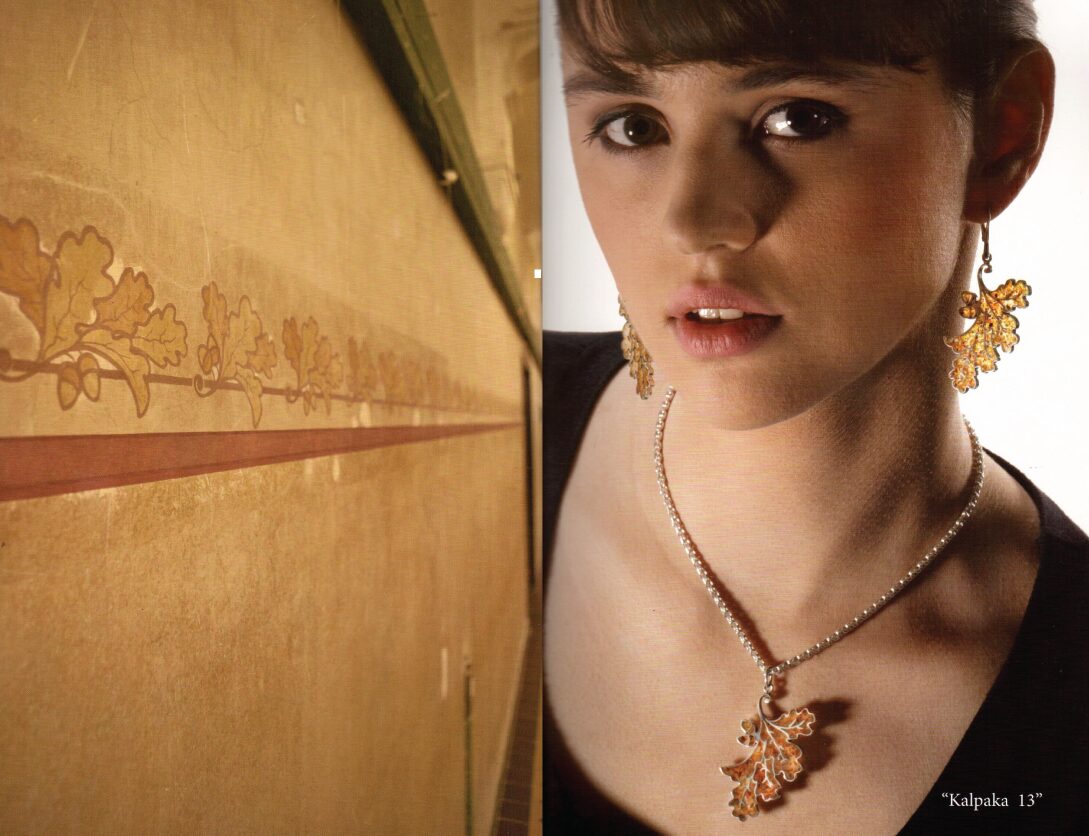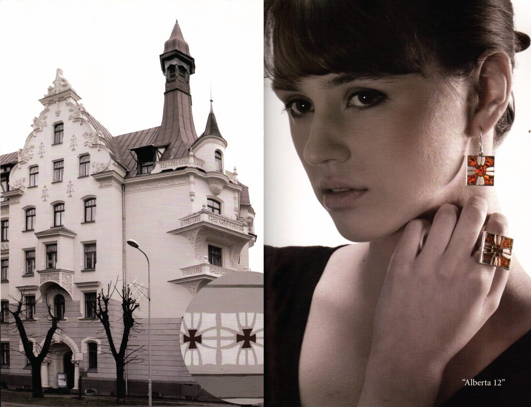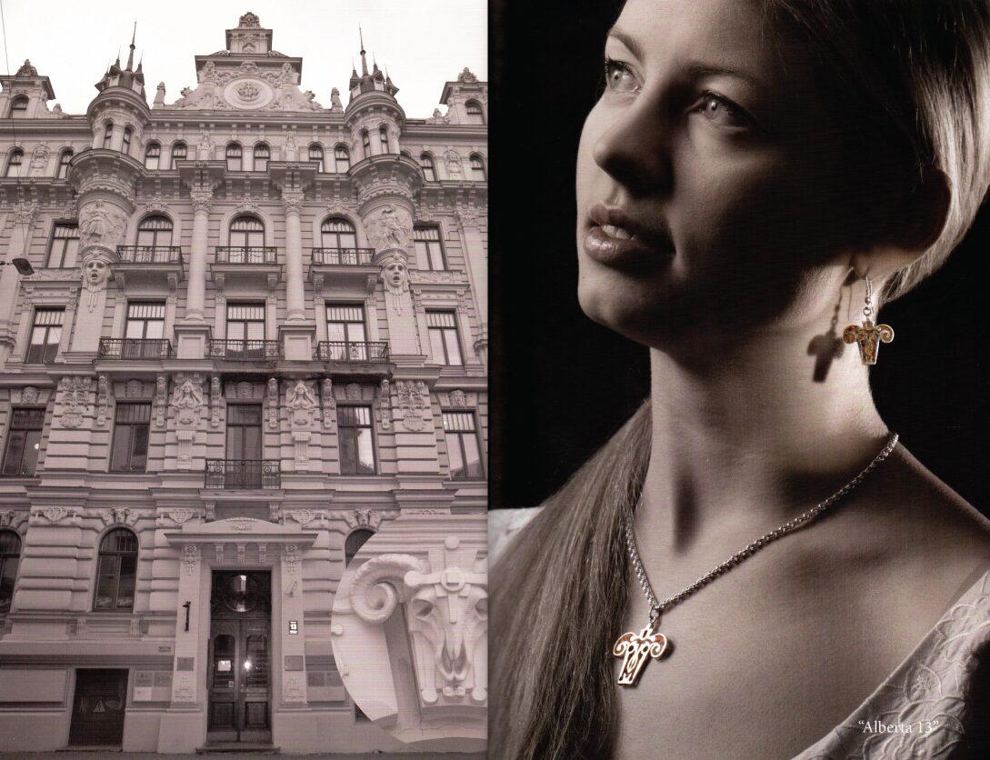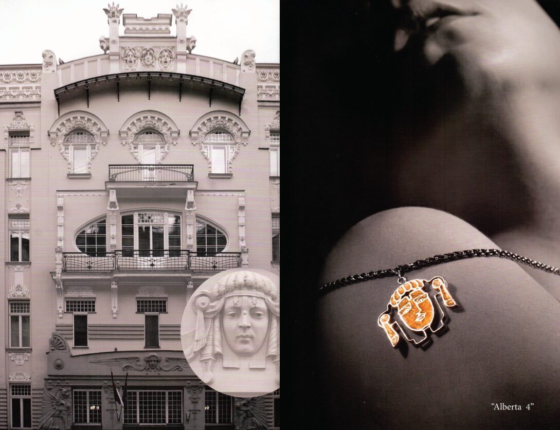 Amber is incorporated into the jewelry using a unique combination of technologies, allowing it to retain its color and shine over time. The jewelry is light and delicate—featuring portraits of Art Nouveau buildings, plant motifs, birds, and other elements.